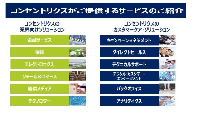 日本コンセントリクスは、2014年5月1日より米コンセントリクス社のグループ企業として日本で業務を開始いたしました。 世界25カ国で、40以上の言語により、100,000人以上のスタッフがお客様にサービスをご提供しております。世界中の金融、保険、リテール&コマース、テクノロジー等10以上の業界において、あらゆる顧客接点の価値を最大化するためのサービスを創造性と革新性を持ったパートナーとしてご支援させていただいております。